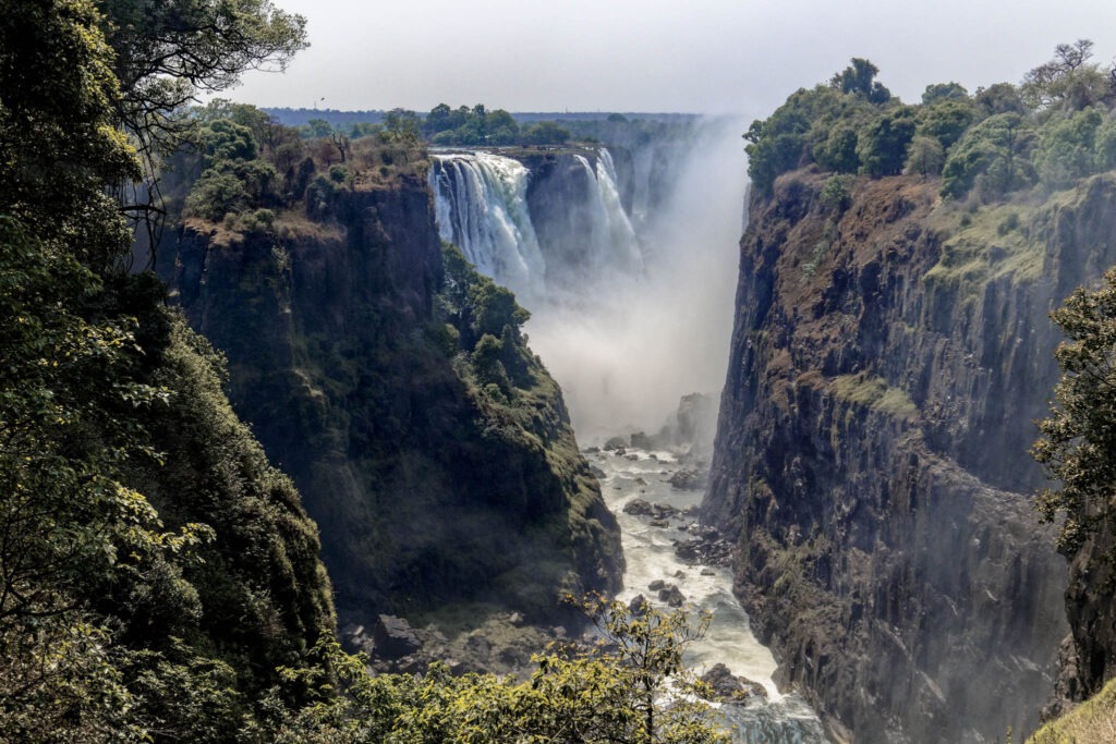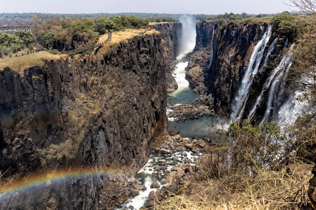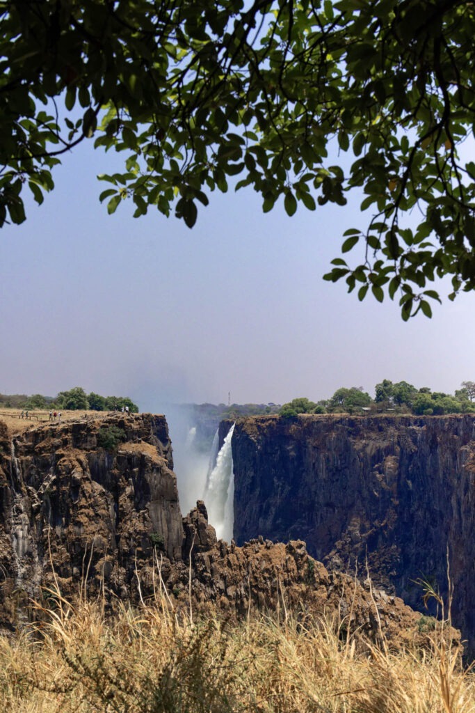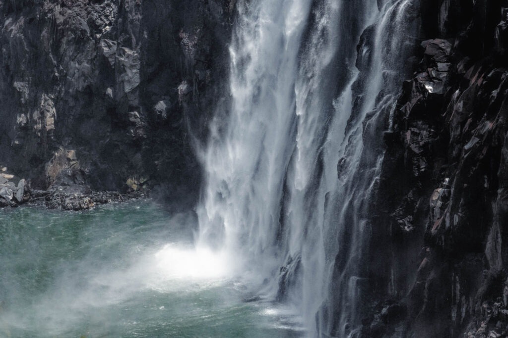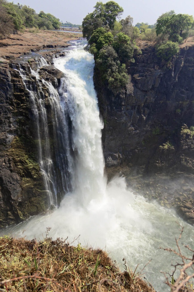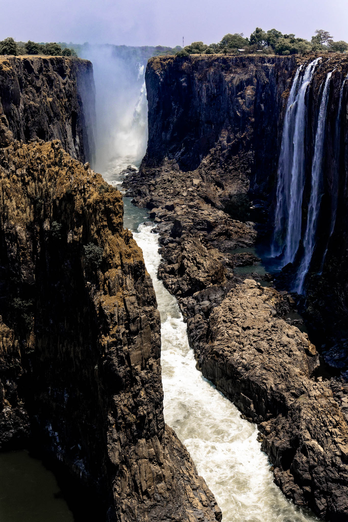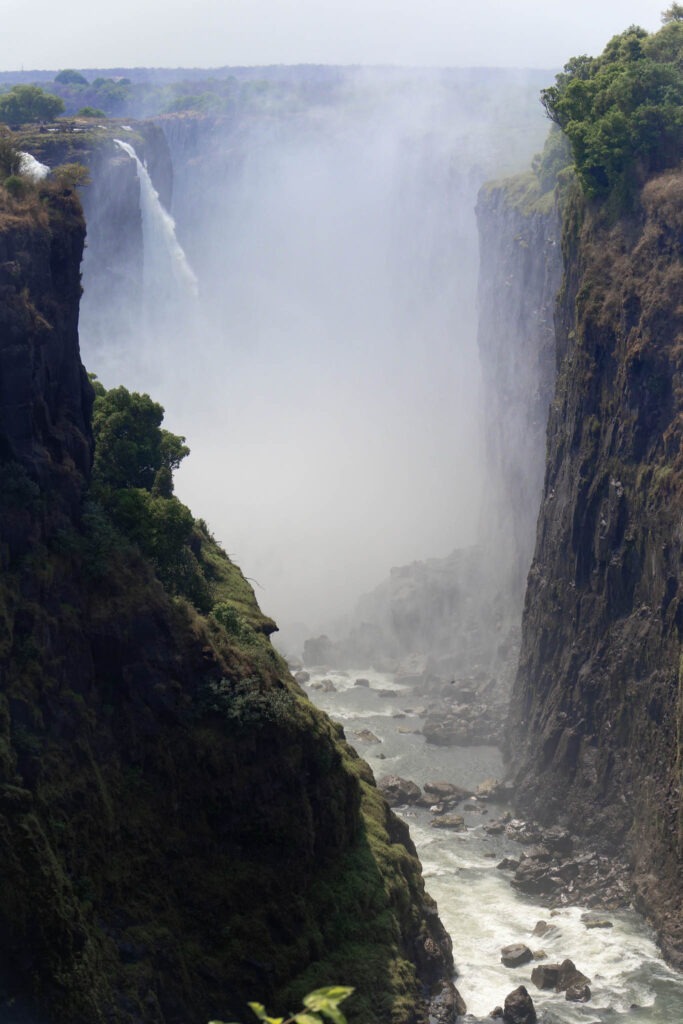 Am westlichen Ende der Victoriafälle schauen wir auf den berühmten Devil’s Cataract. Mit ca. 60 m Fallhöhe ist er zwar der niedrigste Teil der Fälle, durch seine hohe Fließgeschwindigkeit, hauptsächlich während der Regenzeit, aber auch der turbulenteste. Hier stand ich sehr lange. Die wilde Jagd des Wassers durch den schmalen Einschnitt im Felsen hypnotisierte mich fast ein bisschen.