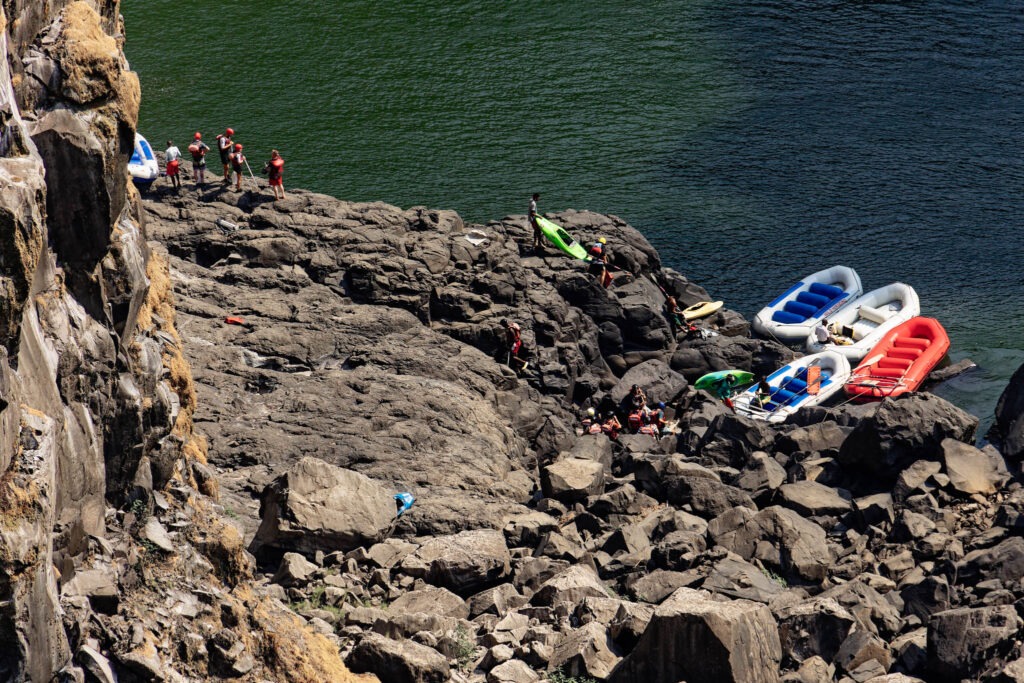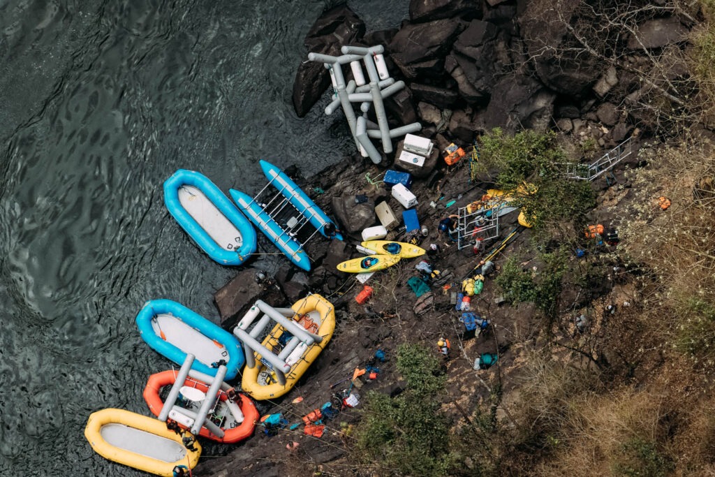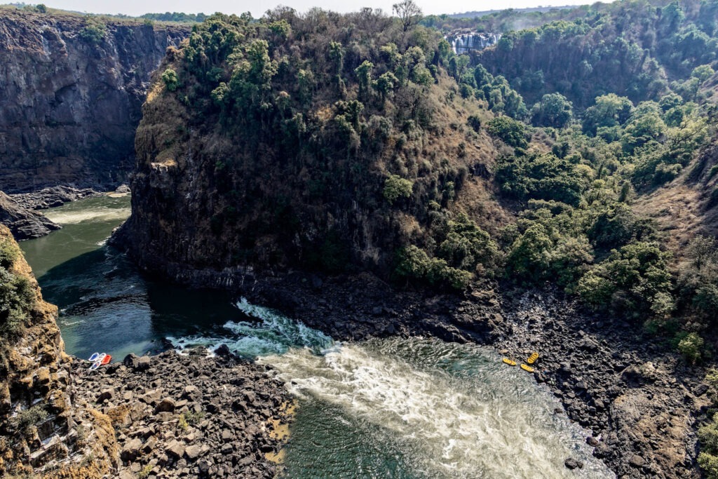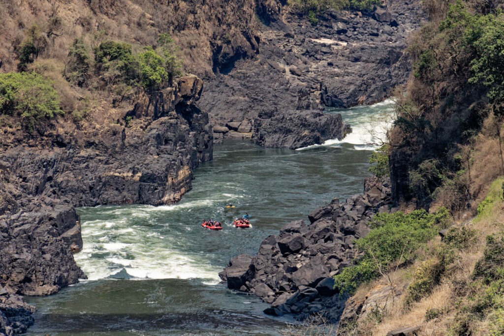 Während ich von oben auf das smaragdgrün schillernde Wasser des Sambesi schaue, schießen unten einige Mitglieder unserer Reisegruppe mit Rafting-Booten durch die Stromschnellen. Es sieht aus, als würden sie in der wilden Strömung tanzen. Respekt an alle aus unserer Gruppe, die sich das getraut haben. Für mich ist damit eine Grenze erreicht. Lieber zusehen, als mitmachen. Für einen solchen Ritt fehlt mir definitiv der Mut.