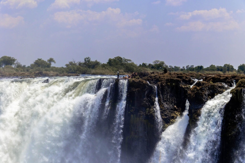 Irgendwann können wir dann auch eine besondere, nicht ganz ungefährliche Attraktion bestaunen. Uns gegenüber befindet sich der Devil’s Pool. In tausenden von Jahren hat sich auf der sambischen Seite direkt am Abgrund im Gestein eine Art Becken gebildet. Man kann einen Badeausflug dort hin buchen, bei dem ortskundige Führer zwar aufpassen, dass niemand über die Kante rutscht, gefährlich ist es trotzdem. Und wie man sieht, gibt es tatsächlich Menschen, die verrückt genug sind, das zu wagen.