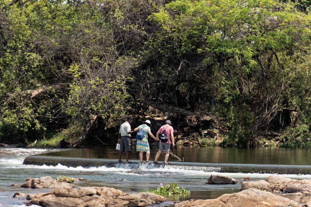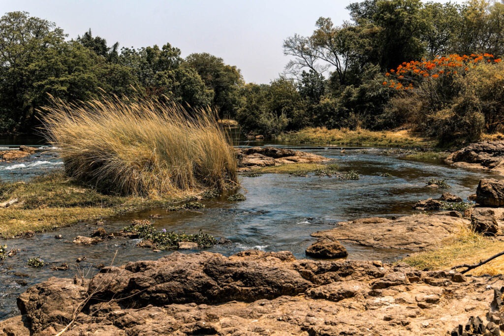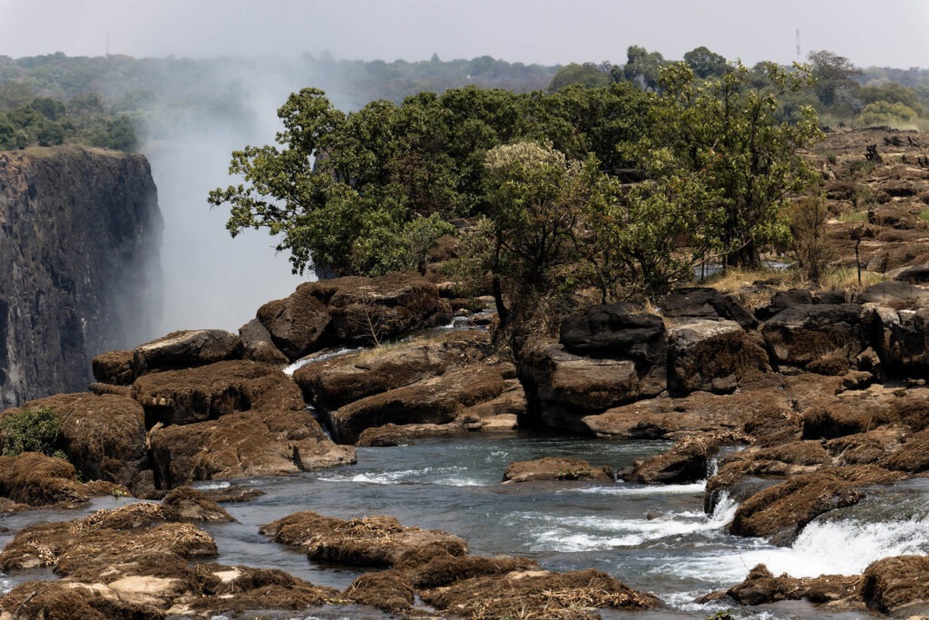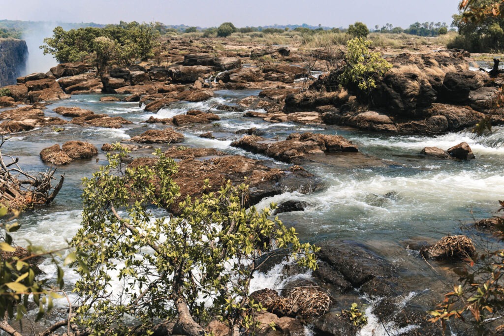 Unser Weg führt uns zu den Aussichtspunkten auf der sambischen Seite. Bald blicken wir über den Sambesi. Jetzt im Oktober fließt er ruhig und gemächlich dahin. Er wirkt beinahe schläfrig, als würde er sich vor der Regenzeit noch ein wenig ausruhen. Das Wasser steht niedrig und gibt Felsen und kleine Inseln preis. Hier herrscht eine fast trügerische Stille, bevor der Fluss wenige Meter weiter sein wildes Gesicht zeigt.